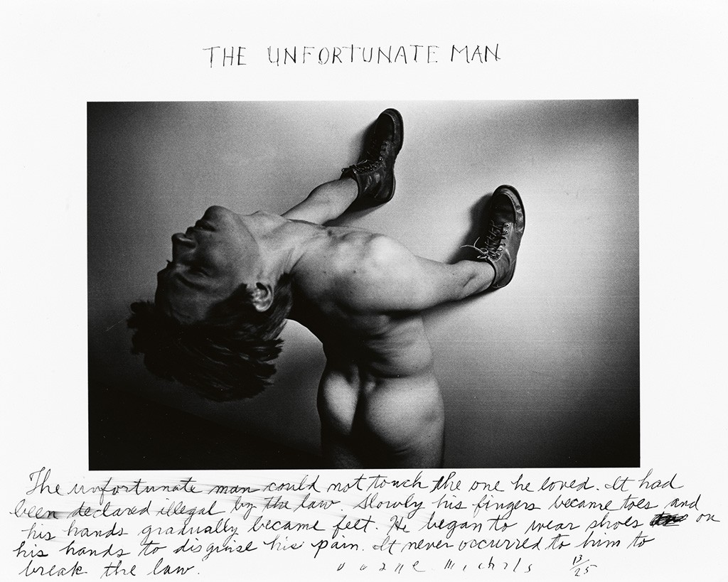 En 1966 comenzó a dar a sus fotografías títulos escritos a mano, que con el transcurso de los años pasaron a ser comentarios cada vez más detallados, donde construía escenas narrativas. En algunos casos tomaron las dimensiones de textos literarios autónomos. Con el aporte de la caligrafía, Michals deseaba acrecentar el potencial cognoscitivo de la narración puramente visual. Al mismo tiempo, su escritura manuscrita aportaba a la fotografía un rasgo gráfico y personal. Como sucede en la inquietante imagen titulada El hombre desdichado (1976), donde cuenta la historia de un hombre que tenía prohibido tocar a quien amaba.