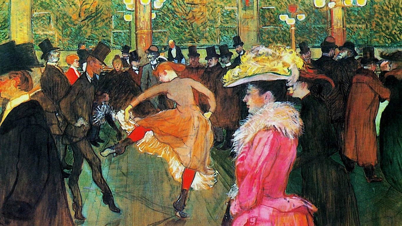 Toulouse Lautrec fue uno de los primeros clientes del afamado club nocturno, de hecho comenzó este ambicioso lienzo, poco después de la inauguración del lugar en octubre de 1889. Según se comenta en el análisis de la obra que brinda el museo “Una inscripción manuscrita en el reverso, […], identifica el tema como ‘la formación de las nuevas muchachas por Valentín ‘el deshuesado”. El apodo de este bailarín y coreógrafo, se debía a su extraordinaria flexibilidad, y se lo puede ver en el centro de la pintura frente a una compañera cuyos animados pasos dejan ver sus llamativas medias rojas y enaguas blancas y vaporosas.