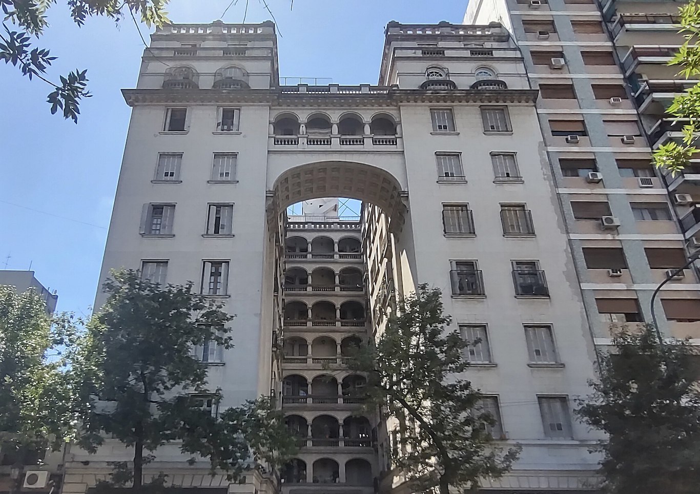El arco que distingue al edificio, visible desde varias cuadras, no es un simple ornamento: constituye el remate del sexto piso y está flanqueado por dos balcones de medio punto que se abren a la calle. Sin embargo, pese a su apariencia de “puente”, el arco no conecta los cuerpos laterales, sino que alberga habitaciones independientes. Sobre él se ubica una terraza con balaustradas, perteneciente a los departamentos del séptimo piso, desde donde se domina el perfil urbano del barrio.