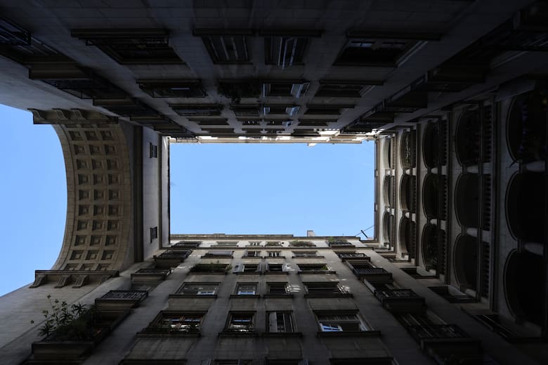 El conjunto se organiza en tres cuerpos de ocho pisos y 54 unidades funcionales, con una única entrada principal delimitada por un portón de hierro artístico de puntas de lanza. Tras él, se abre un patio distribuidor de amplias dimensiones, desde donde se accede a los distintos sectores del inmueble. Las fachadas que dan al patio conservan un friso de granito negro, almohadillado de líneas horizontales y un cornisamento que recorta el volumen con elegancia. Las puertas de madera de medio punto y las ventanas de vidrio repartido completan un aire de época que sobrevive al vértigo contemporáneo.