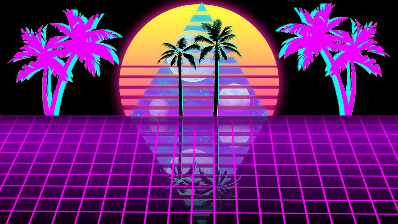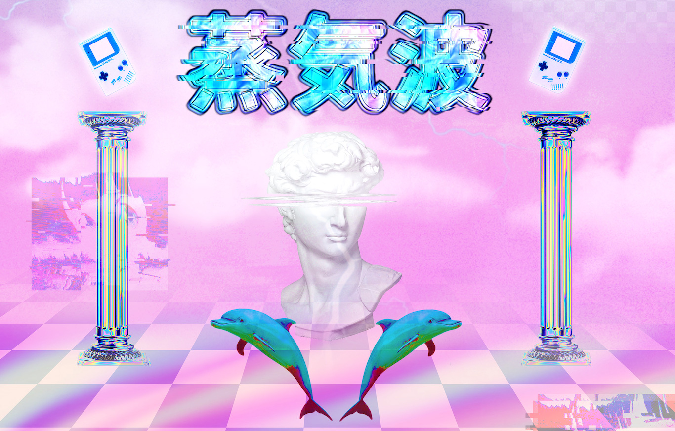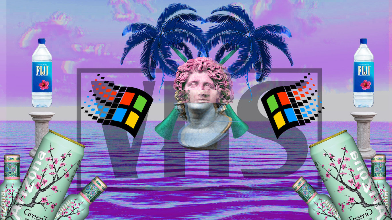 Sus elementos son una suerte de arqueología de lo digital: paletas de rosa, lila, cian, magenta y turquesa. Grillas en perspectiva que recuerdan los gráficos de los primeros videojuegos tridimensionales; bustos greco-romanos de mármol flotando en espacios virtuales; logotipos pixelados de marcas de los ochenta y noventa; textos escritos en katakana o en fuentes de computadora antigua como Times New Roman; y, de nuevo, soles con efectos glitch que se ponen sobre el océano en loop infinito.