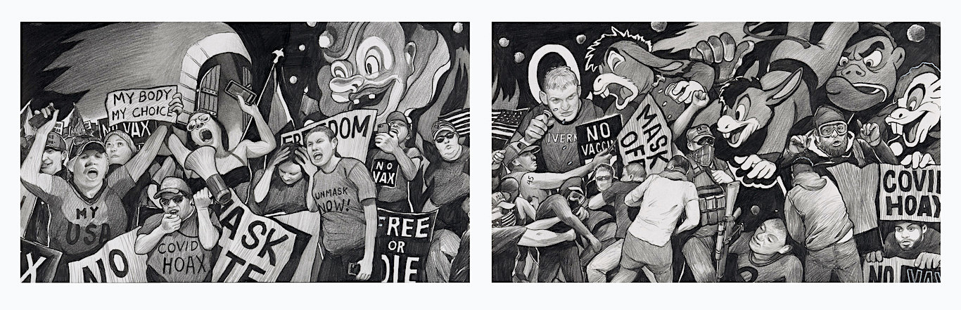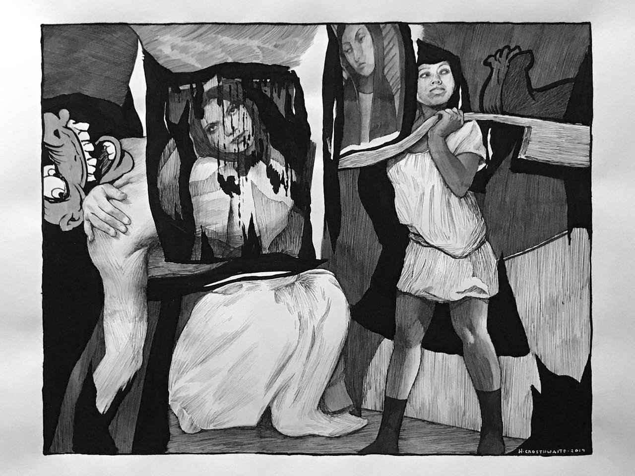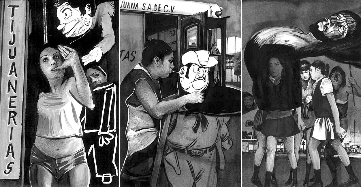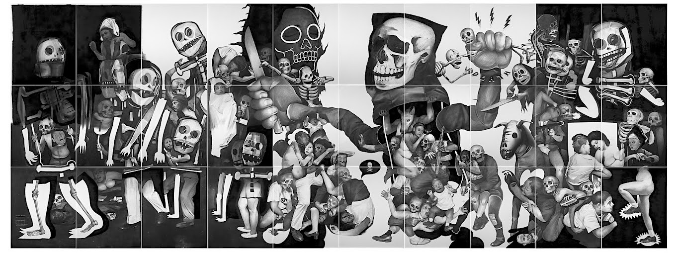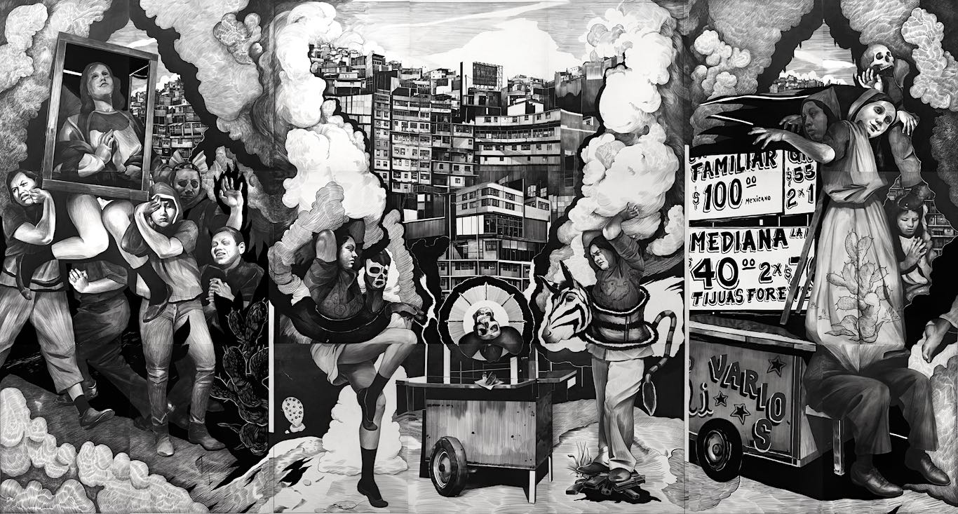 Pero Crosthwaite ve la ciudad y la frontera entre el tercer mundo y el imperio con ojos propios y asumiendo en la cultura mestiza rasgos que se desentienden de cualquier hibridez impuesta por la cultura global. Su Welcome to Tijuana no es un slogan ni un estribillo, sino que tiene la urgencia de una crónica, la densidad de un ensayo y el aparataje descriptivo heredado de la pintura de costumbres y oficios de los old masters holandeses y flamencos. Ni folk ni pop, Crosthwaite comunica con la inmediatez del poster, aunque en sus acrílicos se verifique un axioma que la gran entrevistadora uruguaya María Esther Gillio tenía para con el periodismo: la superficie de un charco con la profundidad del océano. Revisando el horizonte propuesto por The Line, la sucesión que se capta de un vistazo lleva siglos de superposición desde ornamentos precolombinos mesoamericanos a la máscara del jaguar, patrimonio contemporáneo de la lucha libre. En la misma vista panorámica conviven piernas sin cuerpo que zapateaban antes de la conquista; una botella familiar de Coca Cola; un Mickey Mouse deportado (del otro lado de la línea); un joven calavera como los de José Guadalupe Posada y otra que atiende un audio de whatsapp en un smartphone. Todo lo que entra en Tijuana (que es muchísimo) tiene lugar en esta y todas las pinturas de Crosthwaite.