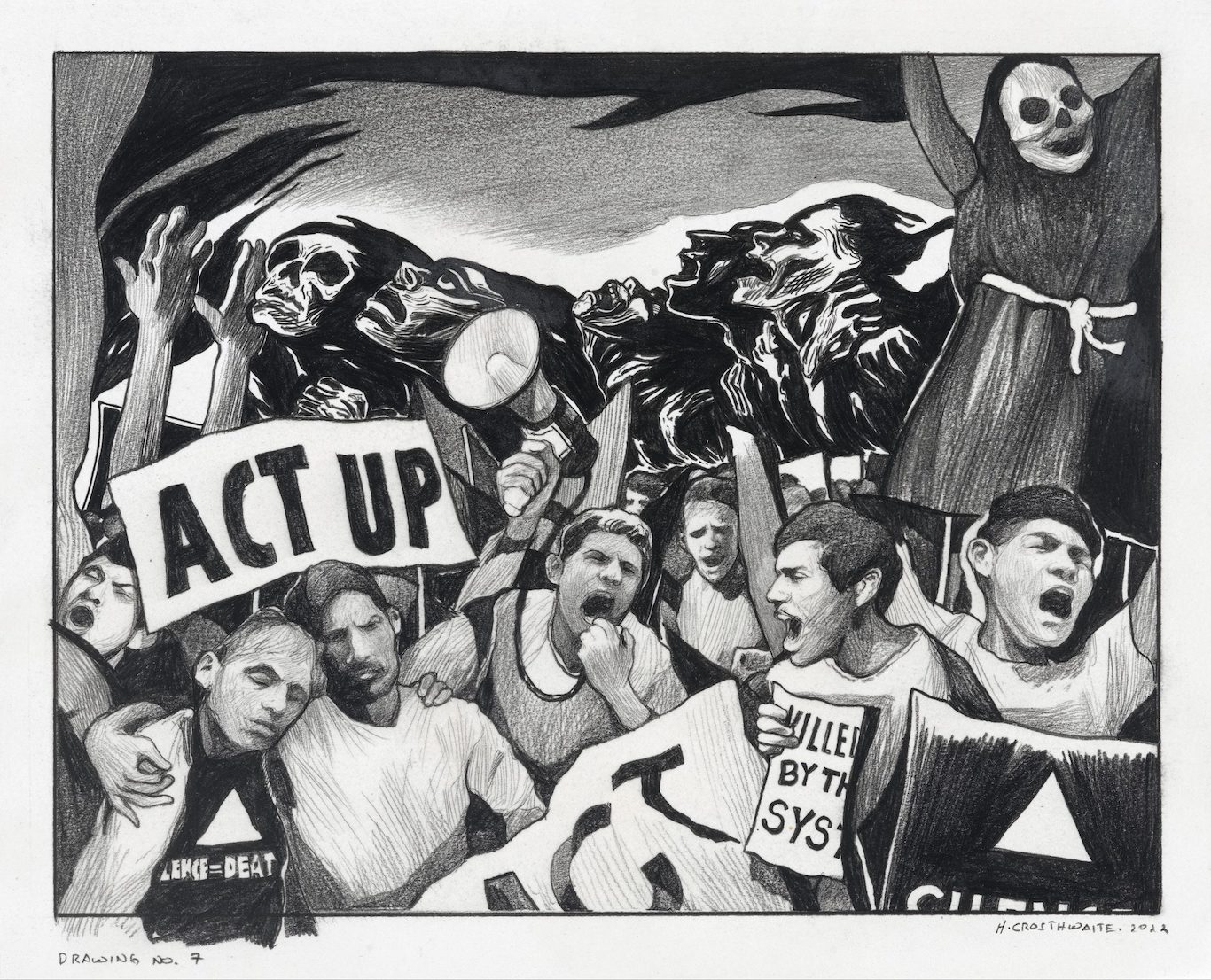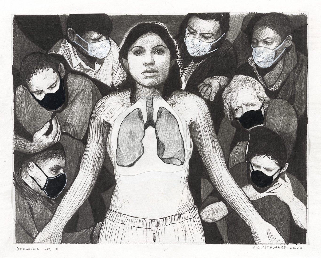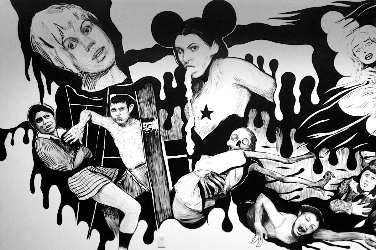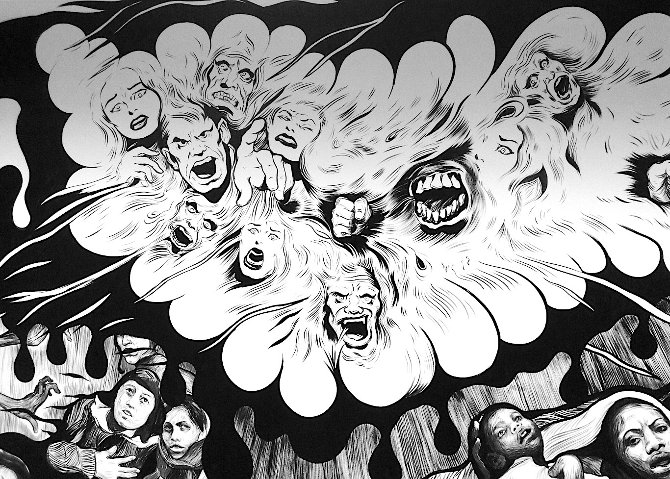 En la pintura mural The line (un esfuerzo descomunal de ocho metros cuadrados), Hugo Crosthwaite (Tijuana, 1971) termina por fundir dos tradiciones bien enraizadas en la cultura visual mexicana. El muralismo, como entrevero entre la revolución y la modernidad, y los exvotos, como gesto artesanal de devoción heredado de la espiritualidad ibérica trasplantada y remixada durante el largo proceso de colonización e independencia de América.