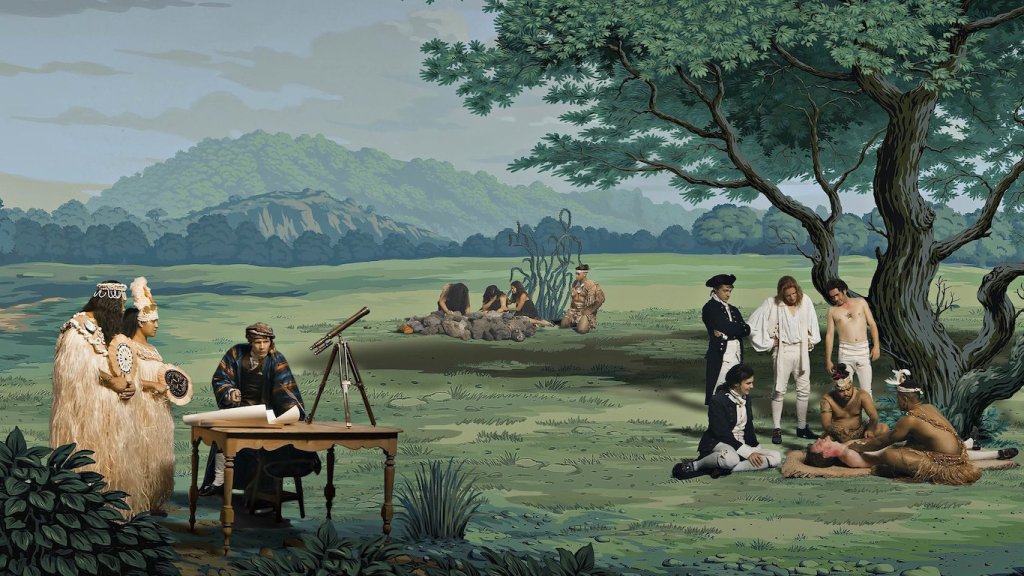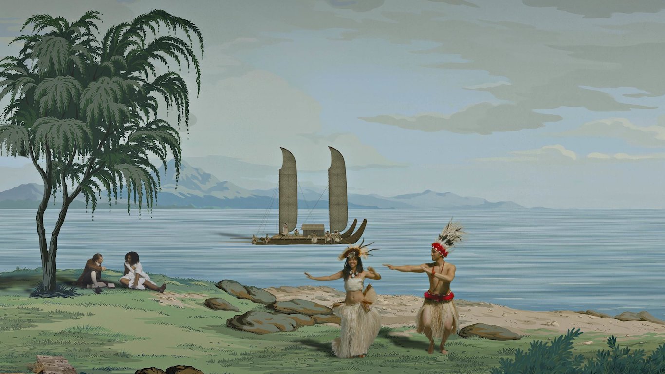 A Lisa Reihana le llevó una década recomponer el malentendido en el que los polinesios originarios se veían, por caso, vestidos con un relanzamiento de las telas grecorromanas para la primavera de 1805. Como si los marinos del Imperio Británico al atravesar el Pacífico hubieran encontrado una especie de edén helénico. Lo hizo en calidad de definición 15K y transfirió las escenas del papel original a una videoinstalación de 32 minutos echando mano a actores y bailarines con técnicas de animación y rotoscopía. No solo incluyó en la nueva versión que debió ser la original a su etnia, sino que desarrolló escenas que fueron parte de las prácticas coloniales y que la narrativa para turismo de sillón dejaba de lado por esa búsqueda de vender el paraíso tahitiano en el mercado francés neoclásico. Incluídas, la explotación sexual de las mujeres nativas de Aotearoa y otra versión sobre la muerte de Cook en Oceanía.
