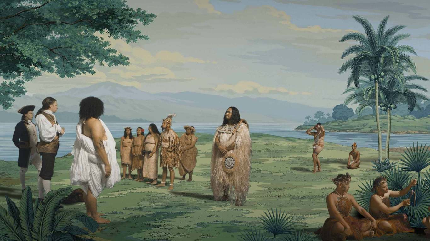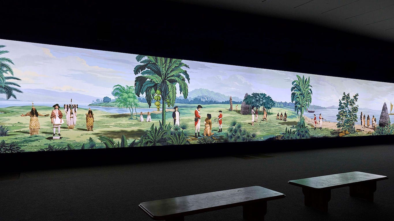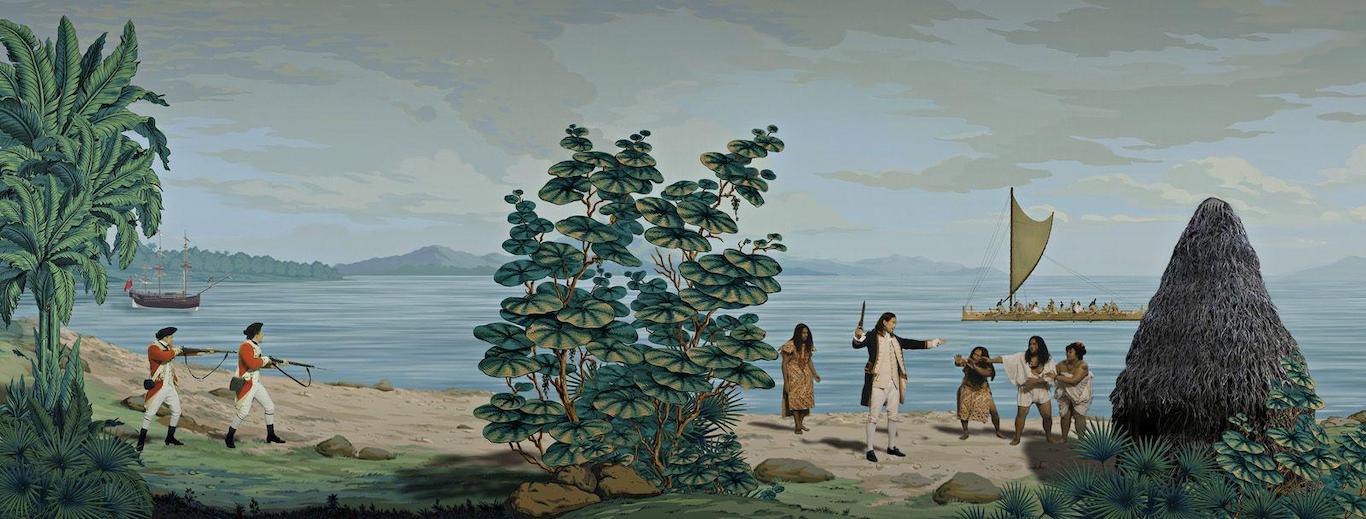 Los cuentos del legendario Capitán Cook pasaron a una especie de escenografía a la que en la época se conocía como “turismo de sillón”, el antecedente de las proyecciones de diapositivas, el super 8 y acaso ahora scrollear selfies de cualquiera desde cualquier lugar del mundo. Sobre esos rumores fue que el empresario Joseph Dufour encargó esa especie de telón escenográfico de casi 16 metros cuadrados que se suponía apto para recrear la imaginación y alimentar el exotismo en cualquier salón neoclásico de Europa.