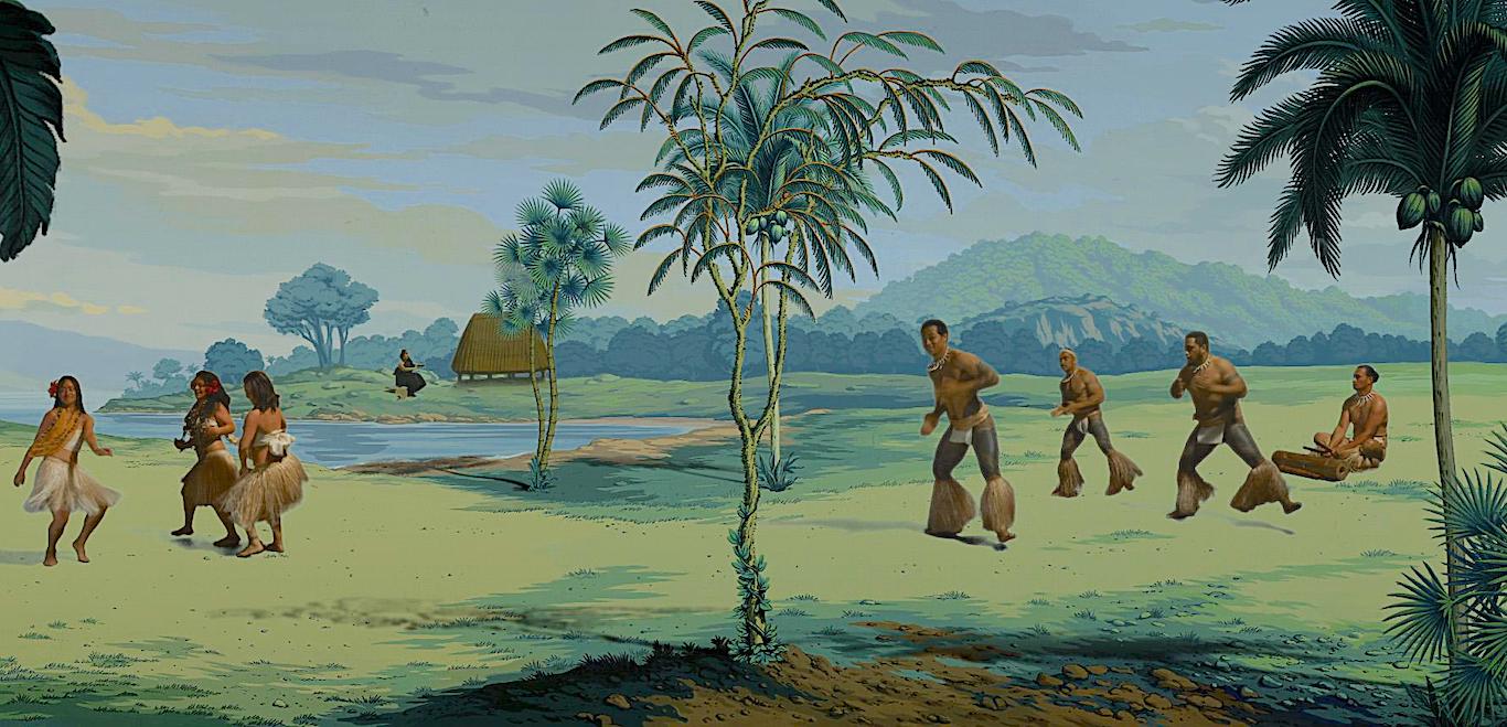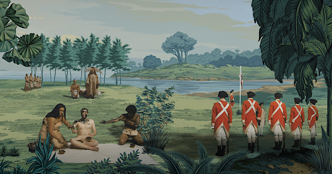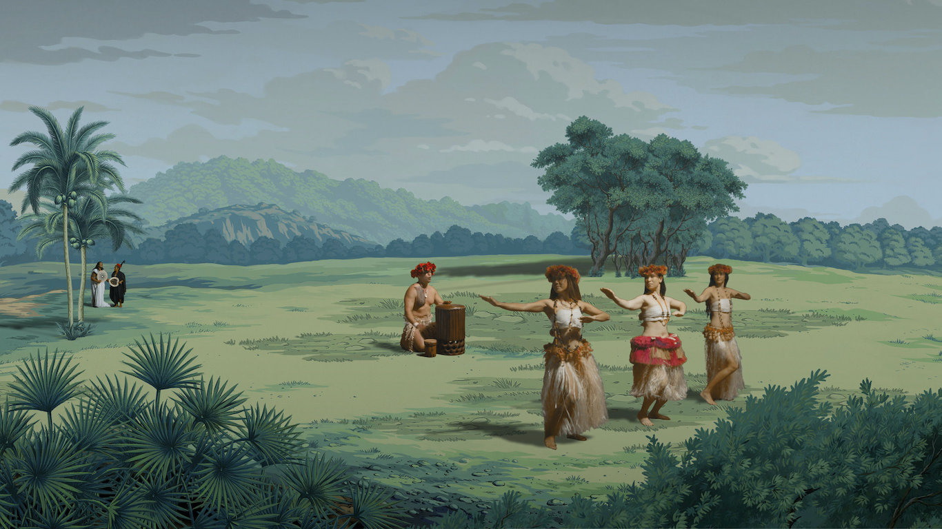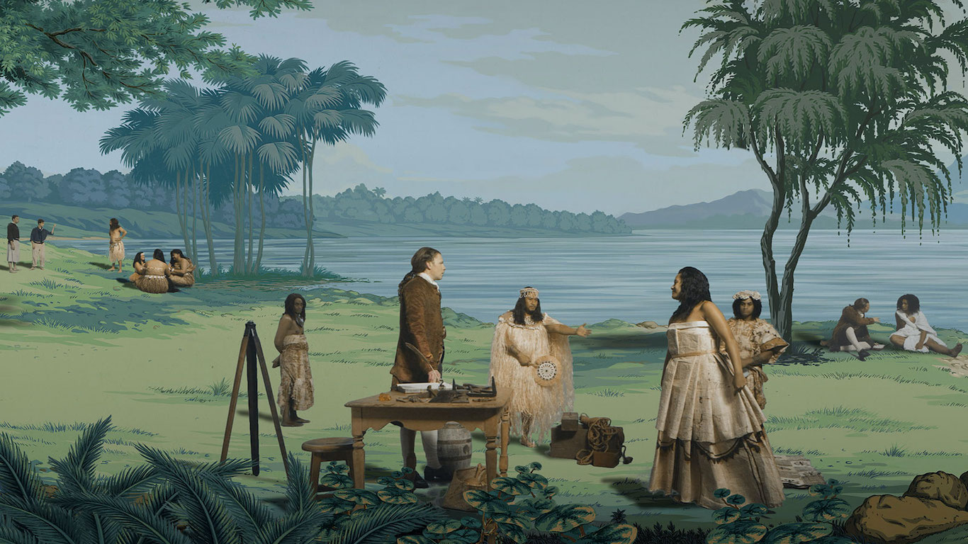 Los cuentos del legendario Capitán Cook pasaron a una especie de escenografía a la que en la época se conocía como “turismo de sillón”, el antecedente de las proyecciones de diapositivas, el super 8 y acaso ahora scrollear selfies de cualquiera desde cualquier lugar del mundo. Sobre esos rumores fue que el empresario Joseph Dufour encargó esa especie de telón escenográfico de casi 16 metros cuadrados que se suponía apto para recrear la imaginación y alimentar el exotismo en cualquier salón neoclásico de Europa.