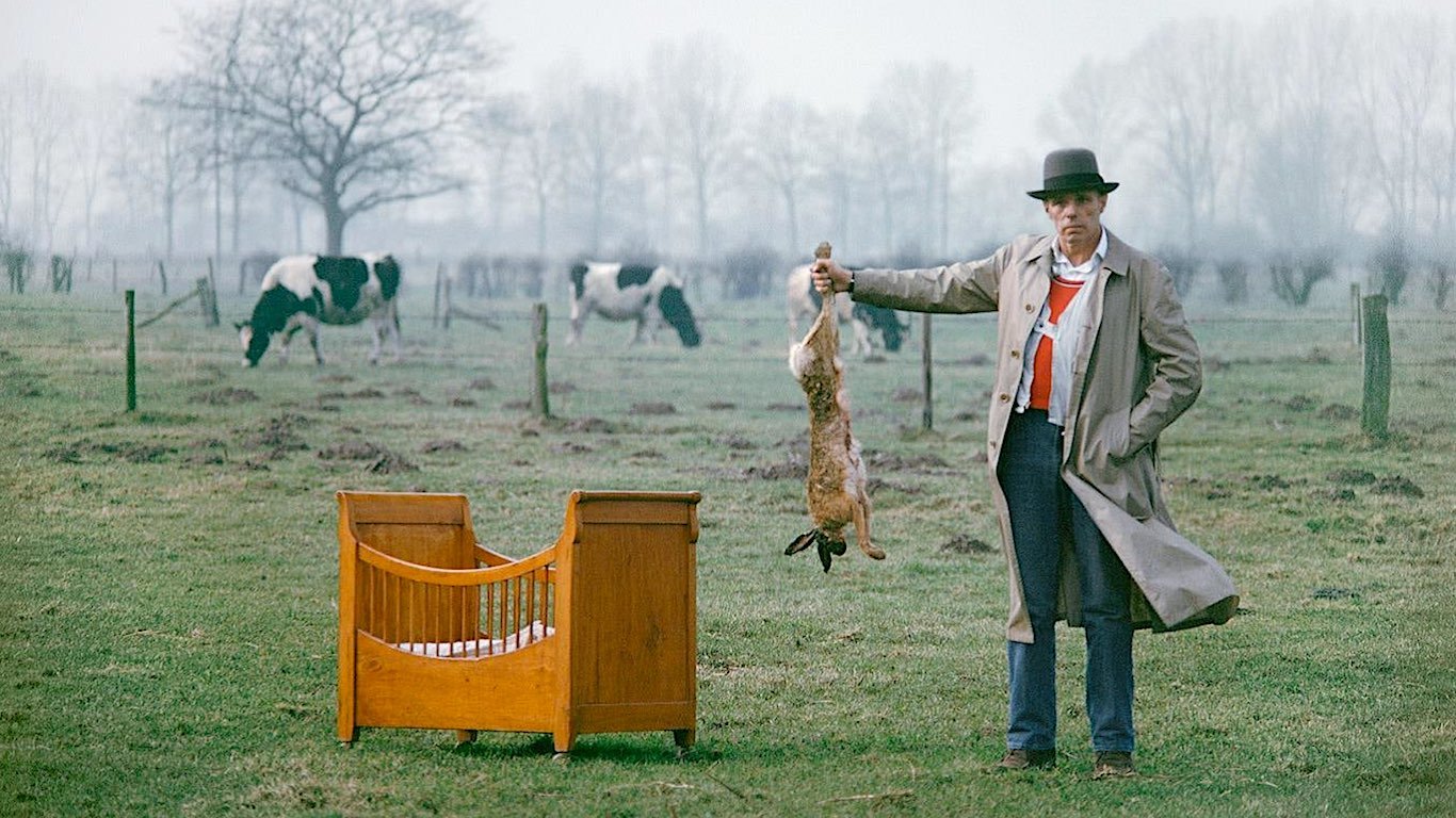 Dusseldorf, 26 de noviembre, 1965. Galería Schmela. 52 segundos del artista Joseph Beuys en Wie man dem toten Hasen die Bilder erklärt (Cómo explicar imágenes a una liebre muerta). La filmación no tiene sonido porque no lo hubo y tampoco se deja ver público alrededor porque el que se había dado cita ese día frío en la ciudad partida en dos por el río Rin fue expulsado por el artista a la calle, la ñata contra el vidrio.