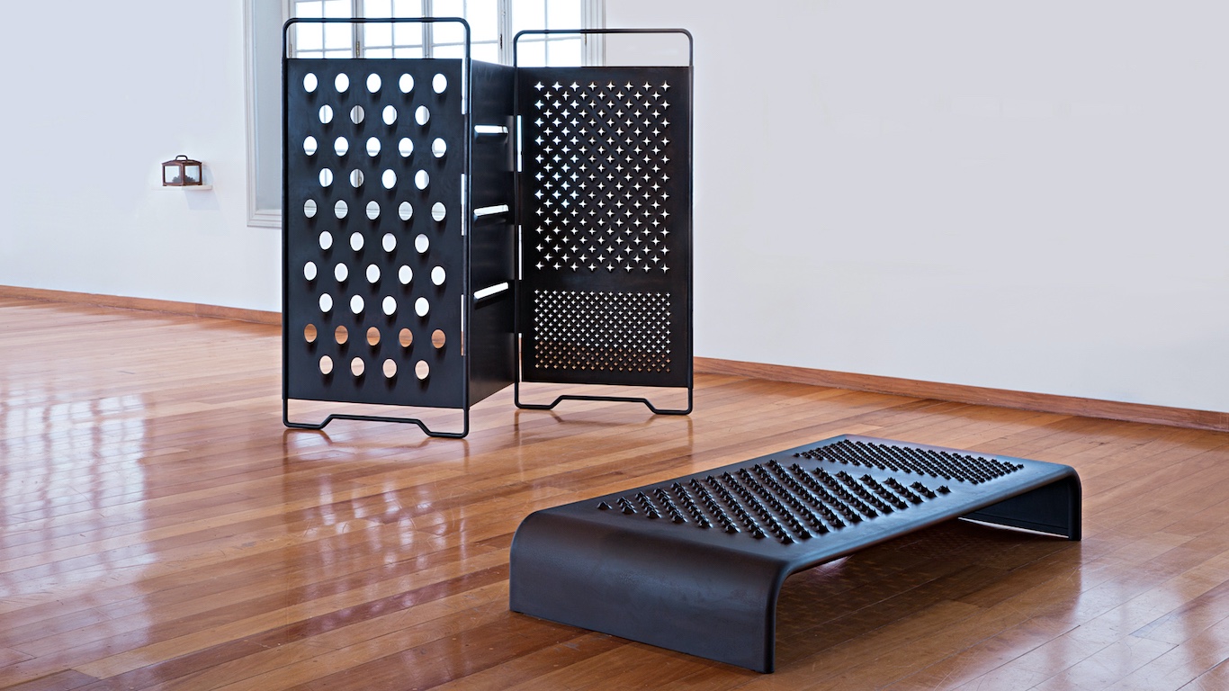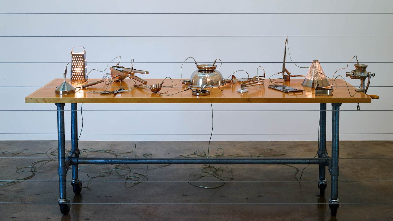 En su forma, Hogar tiene algo de las mesas de Víctor Grippo aunque en lugar de utilizar la materia prima de la comida (las papas mendocinas) la libanesa apela al instrumental de la cocina. Un rallador, un embudo, moldes, un molinillo, dispuestos como en esas cuccina bella de reality gourmet solo que por efecto de la transfiguración de la artista podrían volverse letales para los participantes. Los objetos metálicos están iluminados por un circuito eléctrico que los atraviesa y emite un chisporroteo que es amplificado por dos speakers. Aquí no hay vapor ni especias que recuerden la vida cotidiana del Líbano acaso porque hace demasiado tiempo que la domesticidad se parece a una reja electrificada como los alambres de acero que separan a la obra de los espectadores.