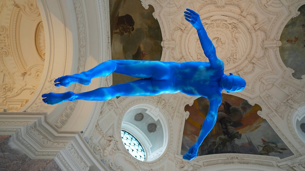 En el ingreso del edificio se encuentran figuras humanas de escala real suspendidas en el aire, camufladas como si fueran cielos con nubes, iluminadas principalmente por la luz natural que ingresa por la cúpula transparente y los grandes ventanales del edificio. Los cuerpos parecen flotar dentro del vestíbulo principal, rodeado por el ornamento característico de las construcciones francesas del siglo XIX.