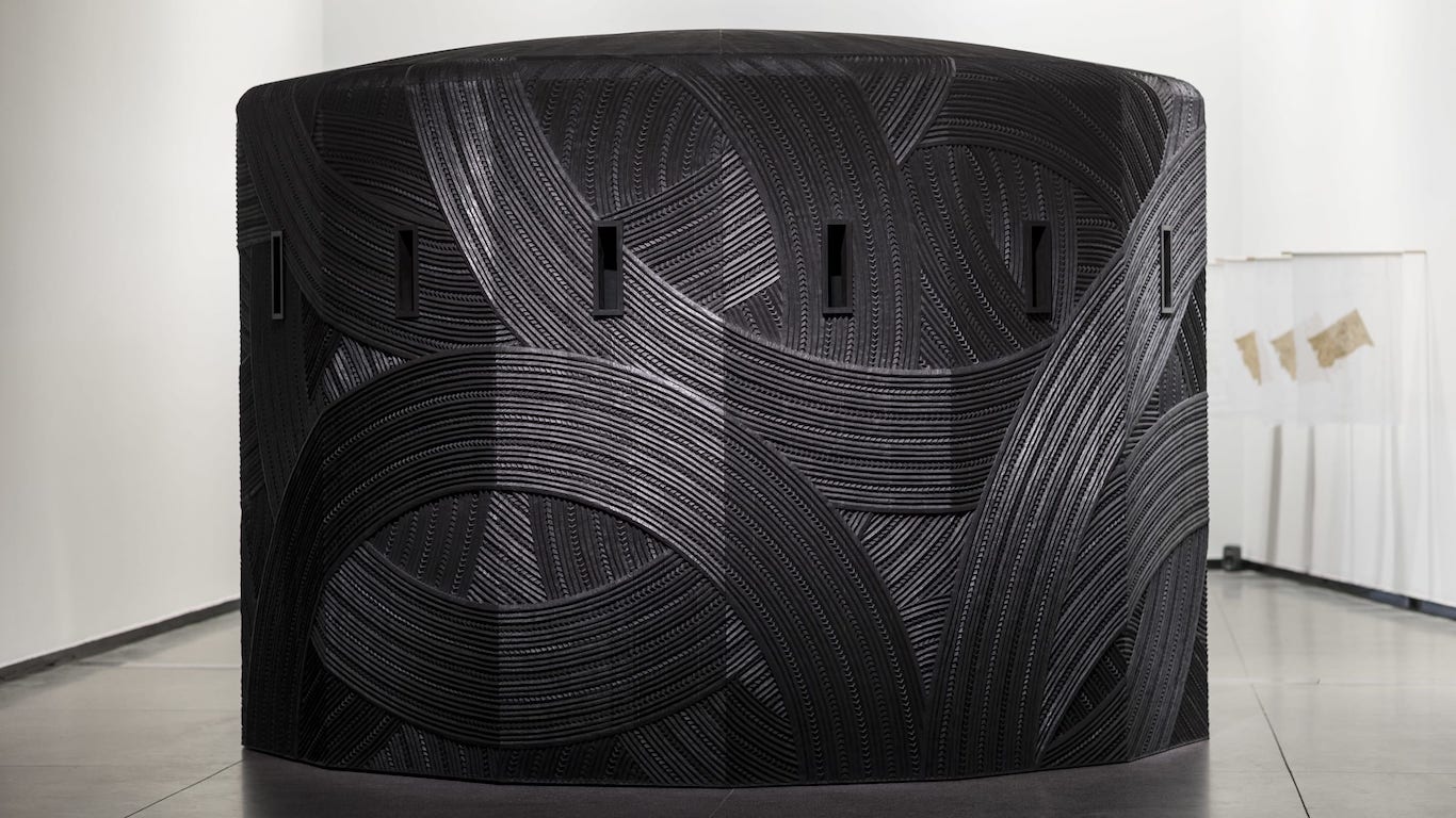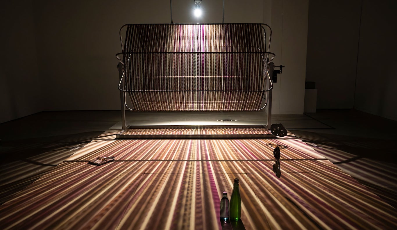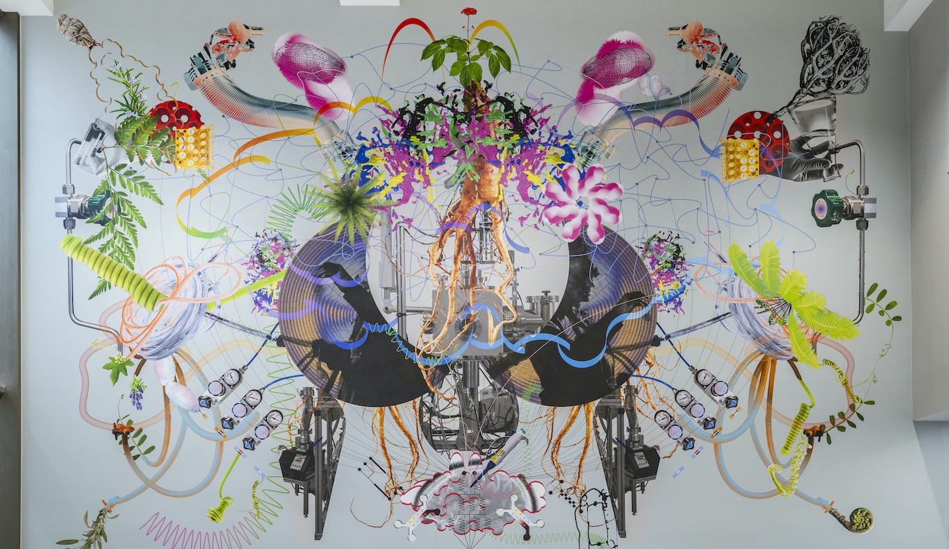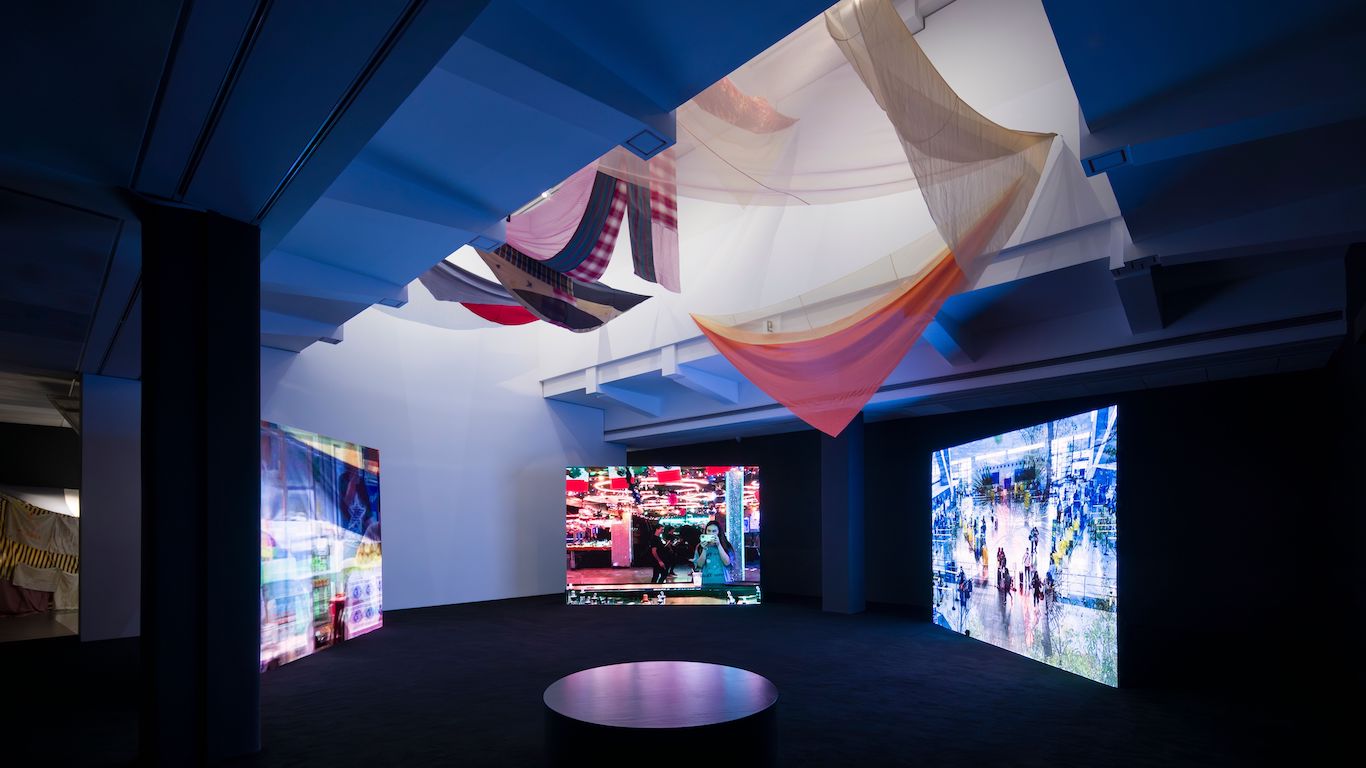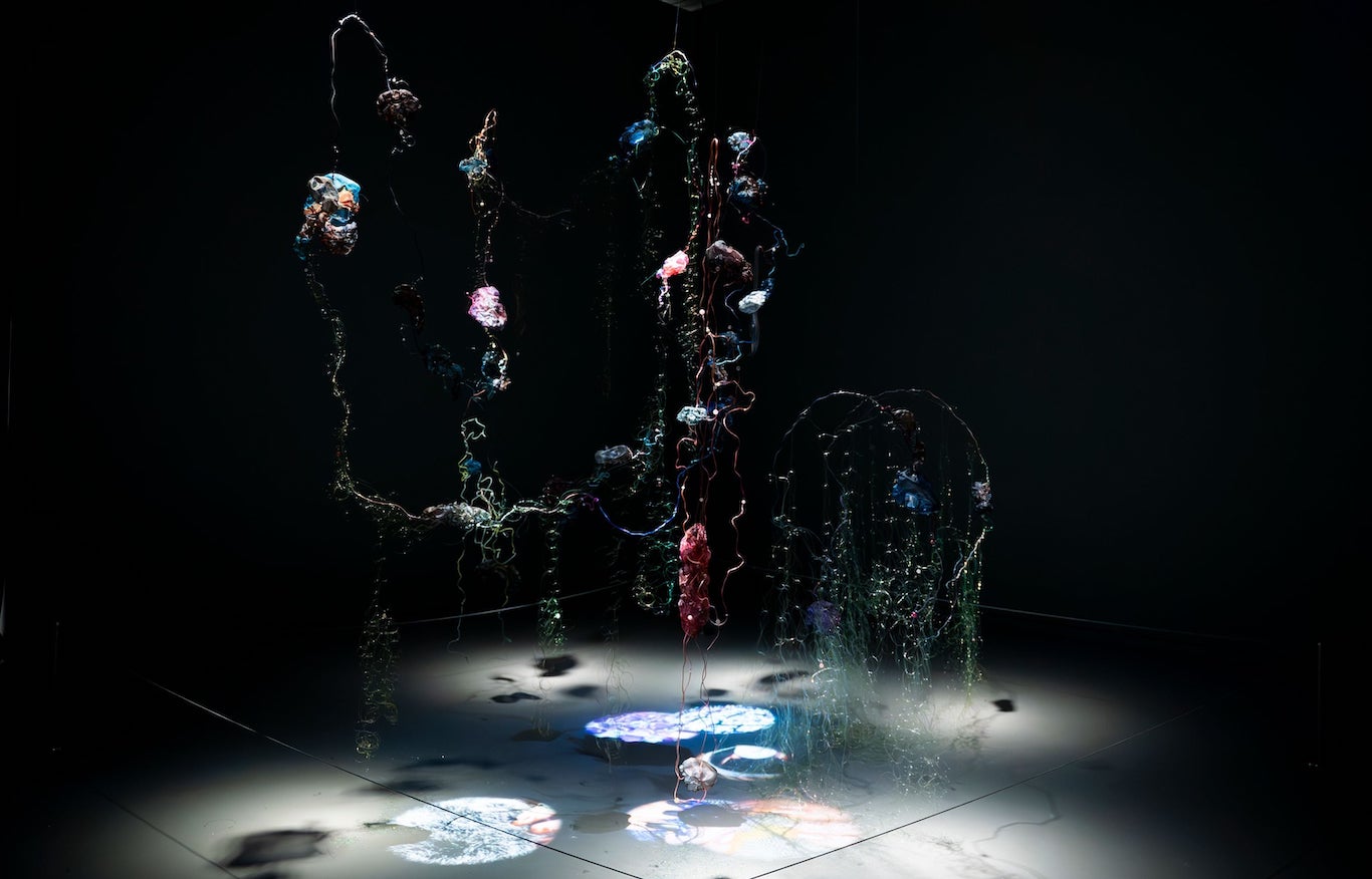 El diseño expositivo, a cargo del estudio all(zone) al mando de Rachaporn Choochuey, refuerza esta idea de paisaje construido, entre lo natural y lo tecnológico. Hay bloques de hormigón crudo (en sintonía con el vocabulario industrial del edificio) que funcionan como accidentes u obstáculos que modulan la mirada, generan puntos de observación y organizan el espacio sin clausurarlo. Se huele una inspiración en los jardines de paseo del este asiático, que van revelando de manera progresiva las distintas etapas. Al moverse por el espacio, cada desplazamiento modifica las relaciones entre obras, arquitectura y cuerpos, de manera que las personas que están visitando son otras formas de vida circulando en esa ecología provisional.