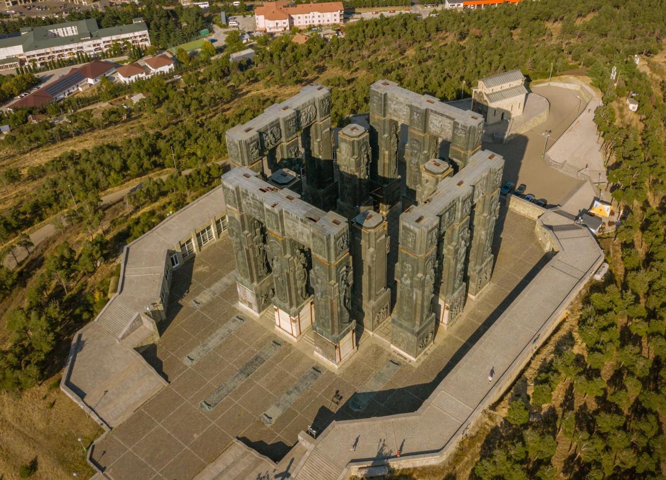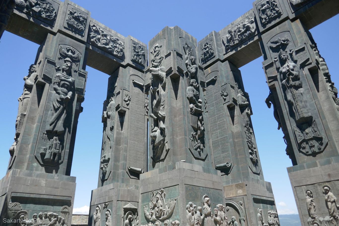 Para subir, hay que seguir las escalinatas que, como calles, serpentean por la colina. Las columnas, de entre 30 y 35 metros de altura, están construidas principalmente con núcleos de hormigón armado recubiertos de piedra basáltica oscura, lo que les da una textura rugosa y un color profundo que se integra con la colina. Los relieves y figuras son de bronce fundido, y su pátina verdosa contrasta con la piedra, otorgándole profundidad a las escenas que narra la obra, también conocida como el “Memorial de la Historia de Georgia” o “Stonehenge Georgiano”, por su parecido con ese monumento megalítico de Inglaterra.