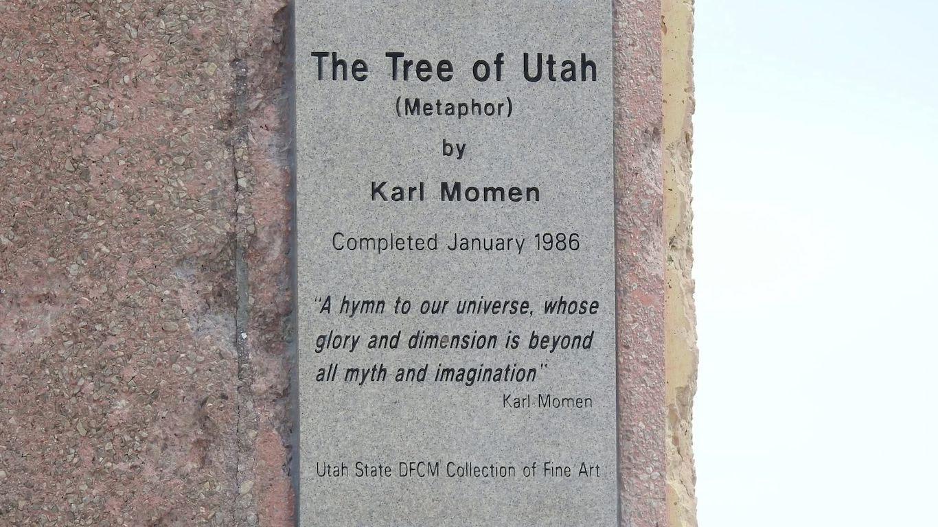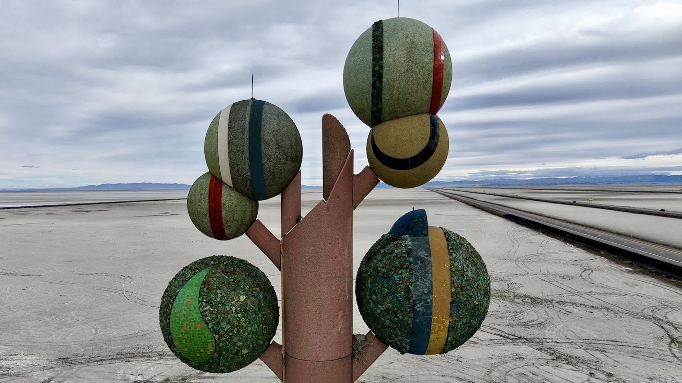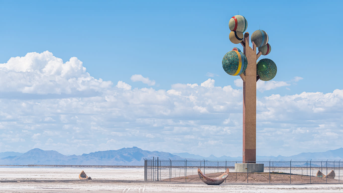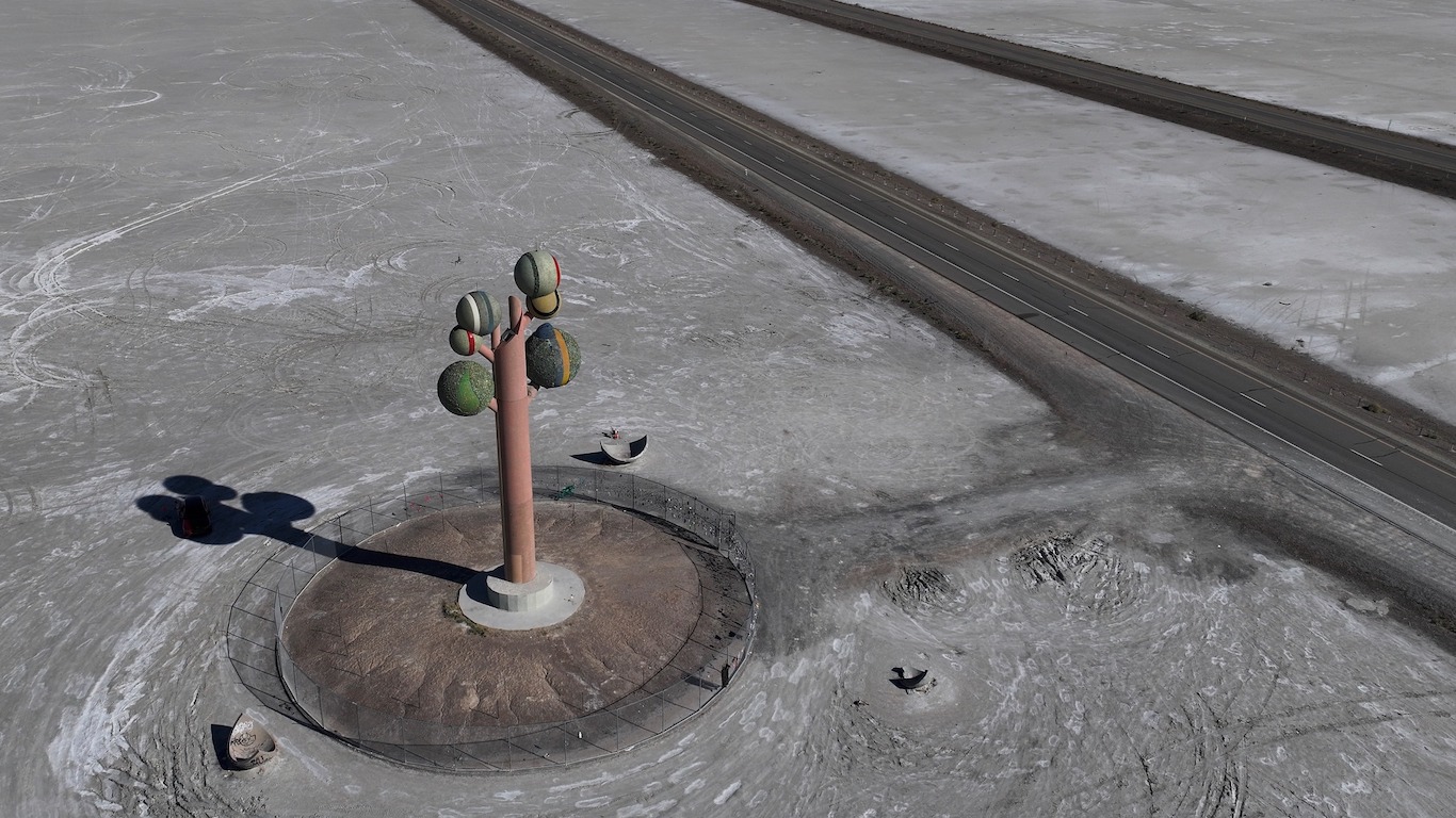 Metaphor: The Tree of Utah, también conocido como el Árbol de la Vida, de alguna manera es una respuesta a eso. Un rapto de color y forma que provoca algo único en la postal casi monocromática que la rodea. La escultura se compone de un tronco cúbico y anguloso que sostiene seis esferas multicolores recubiertas con rocas nativas de Utah. En la base, varios fragmentos esféricos huecos descansan sobre la sal como hojas o cáscaras caídas.